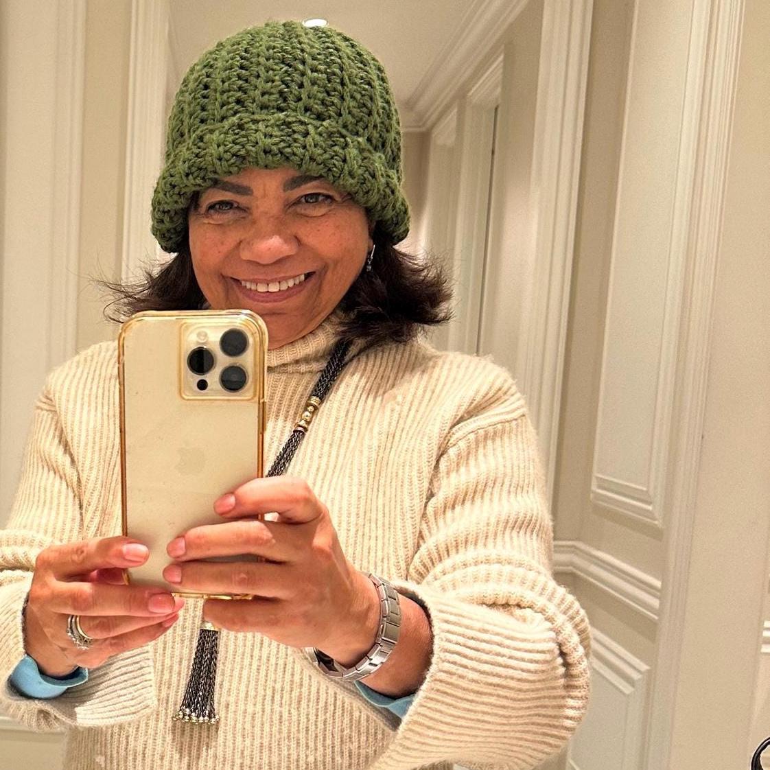Hand crocheted beanie hat made with speckled beige wool blend yarn and faux fur pom pom